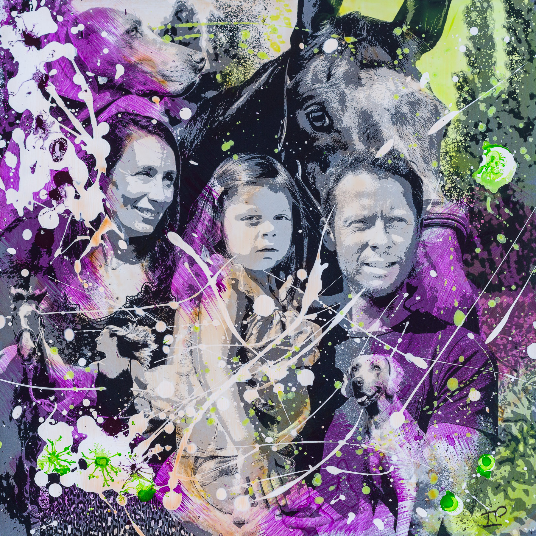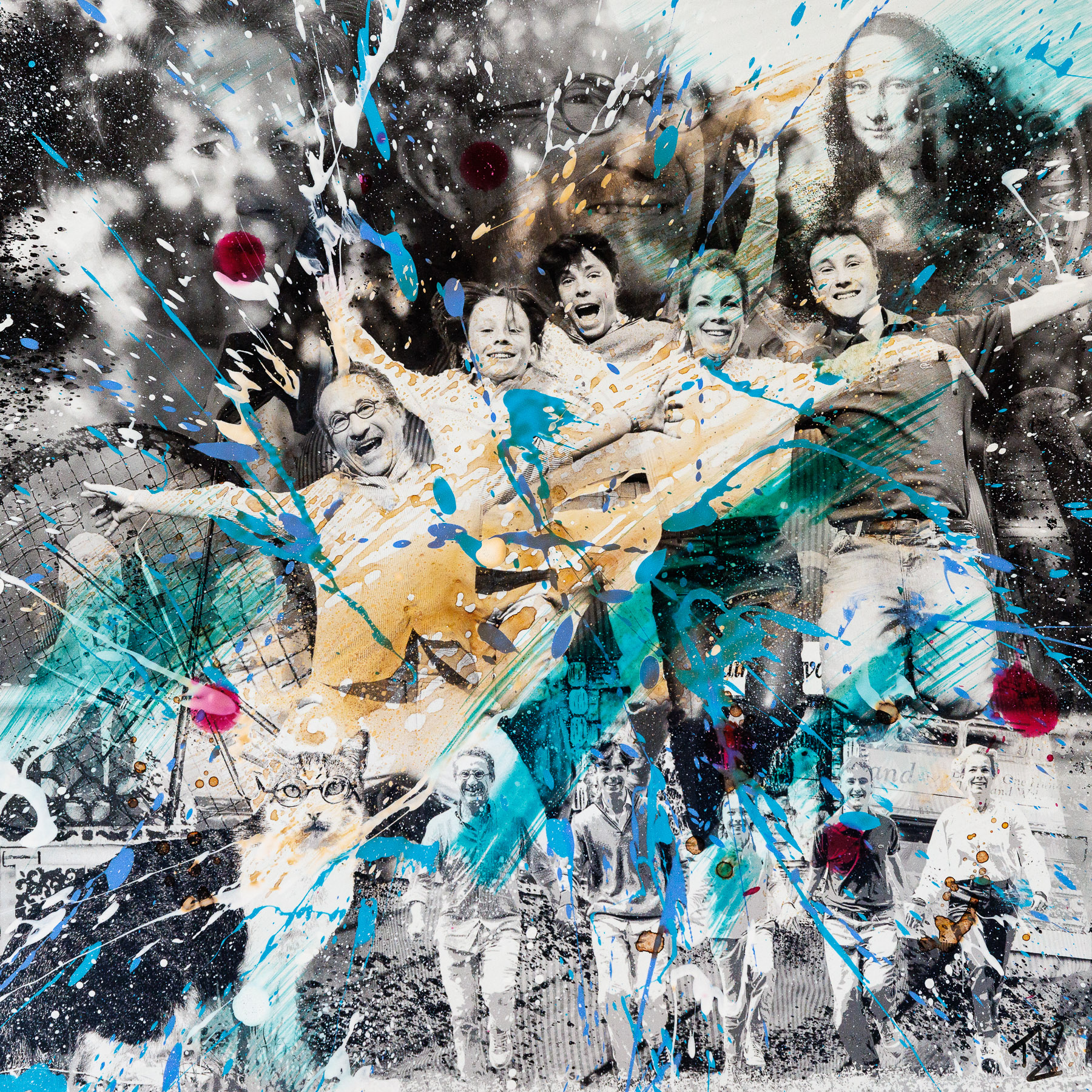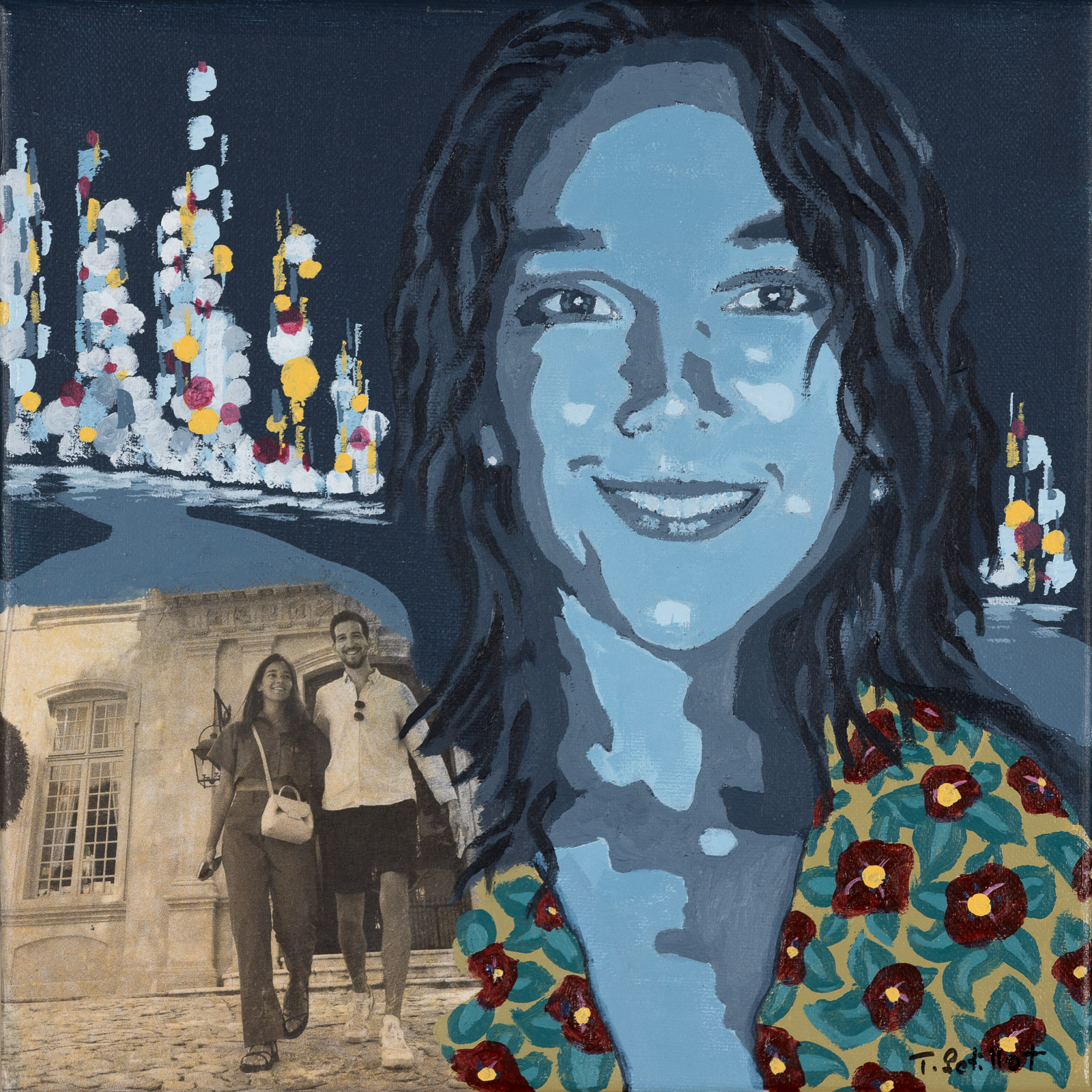 Puis, dans l’intimité de mon atelier, je tisse ces fragments d’existence en une composition vibrante, un montage photographique imprimé sur aluminium ou papier aquarelle, que je sublime ensuite par le geste libre et lumineux de la peinture.