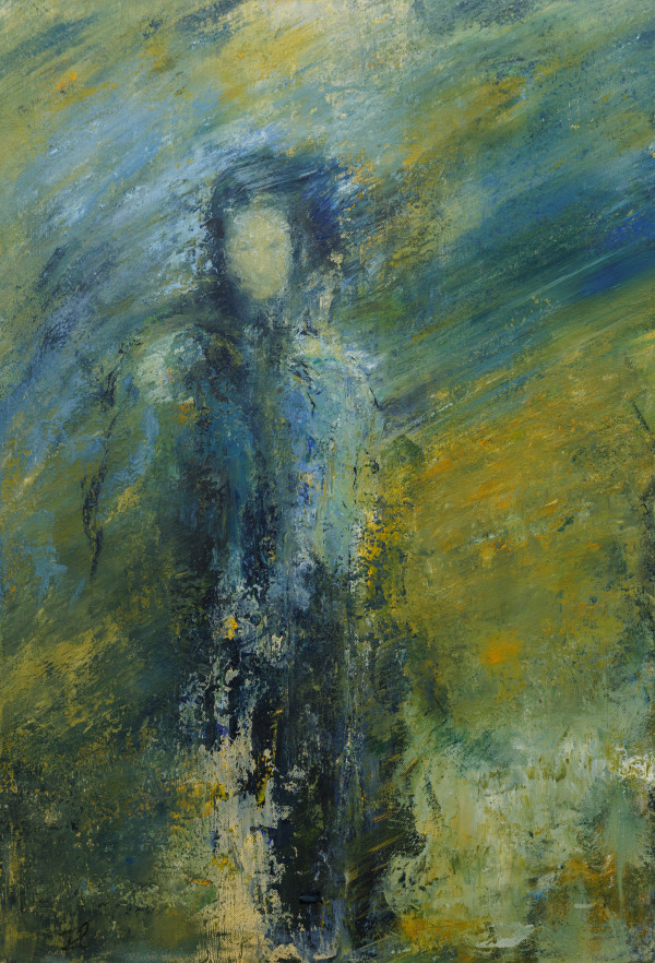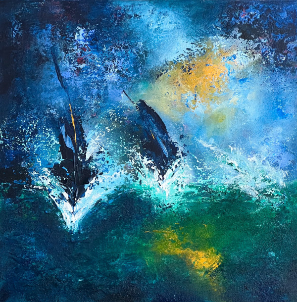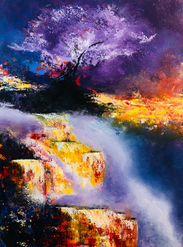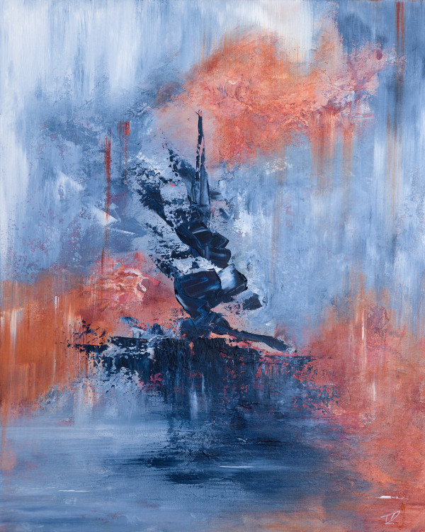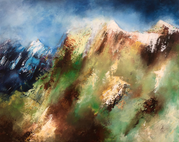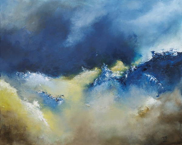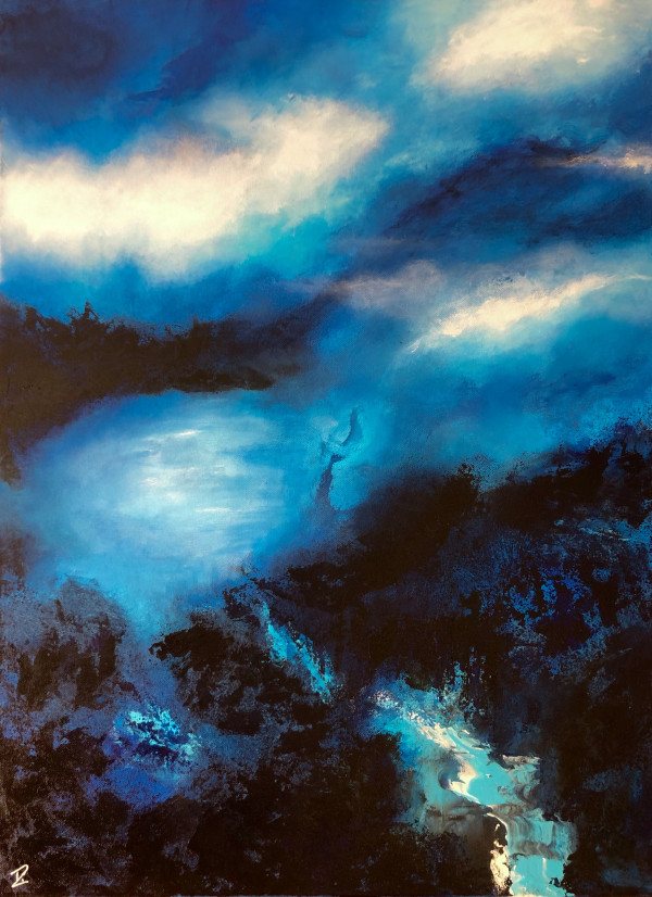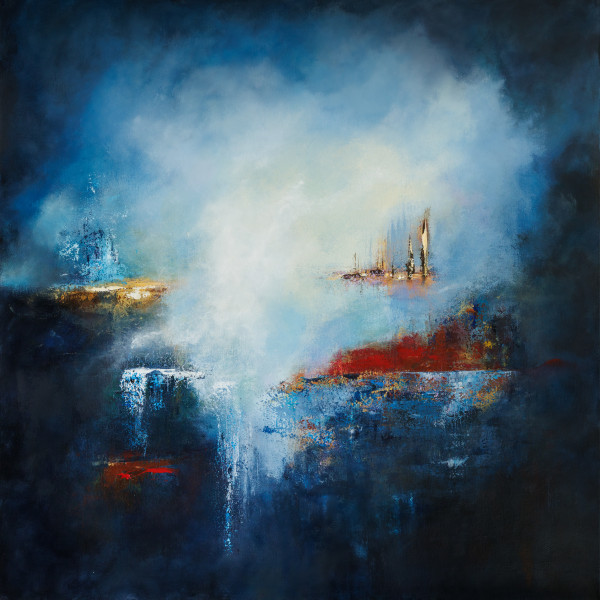 Œuvre abstraite évoquant un ciel azur où la brume de l'esprit façonne des univers sensoriels oniriques.